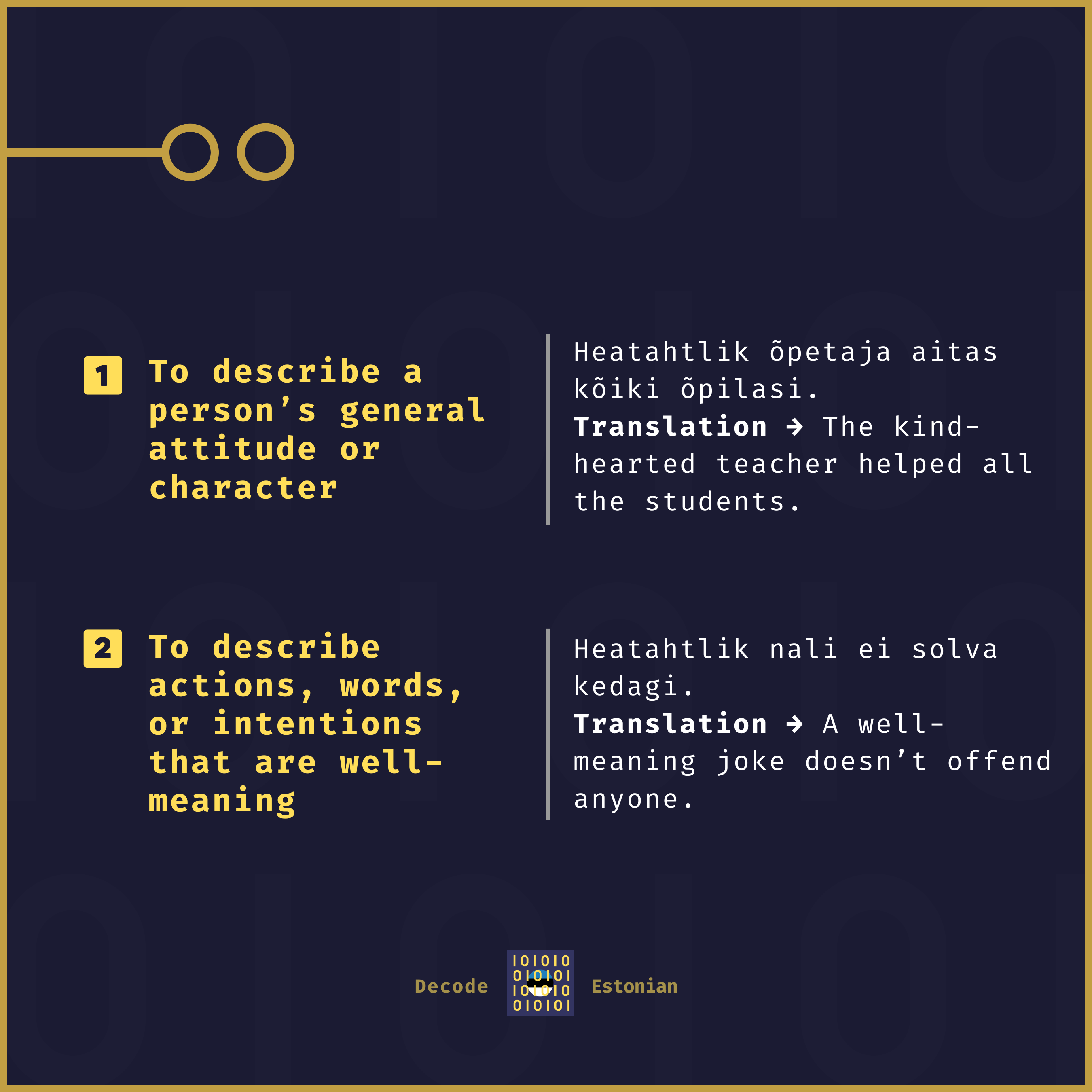 heatahtlik - Adjective - Nominative Singular: "kind-hearted"